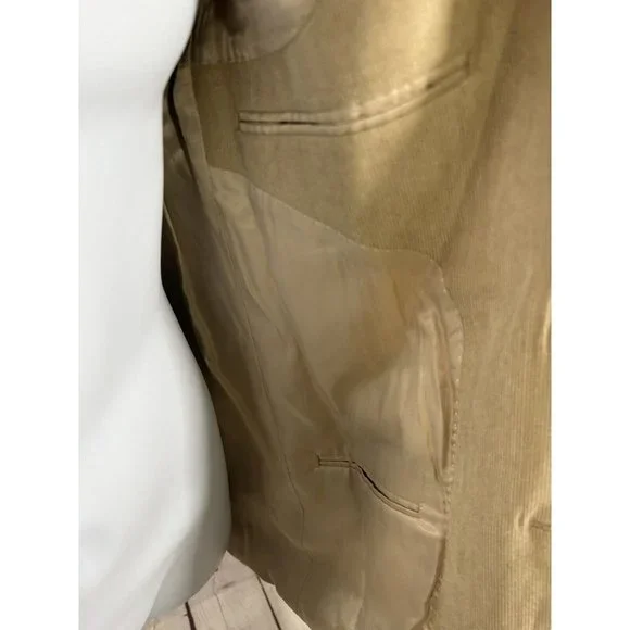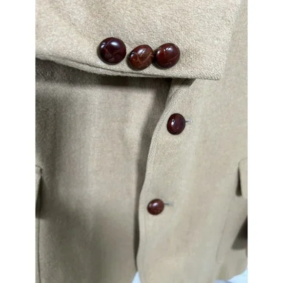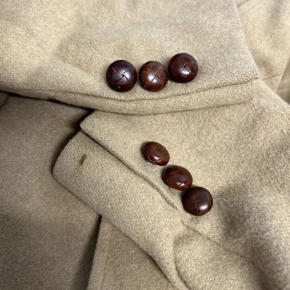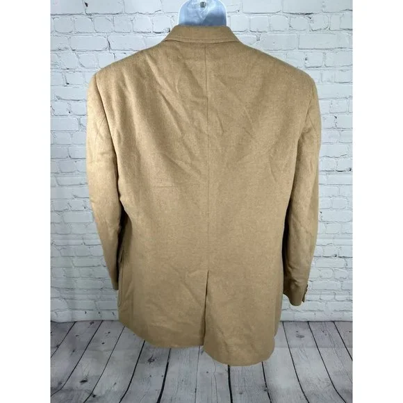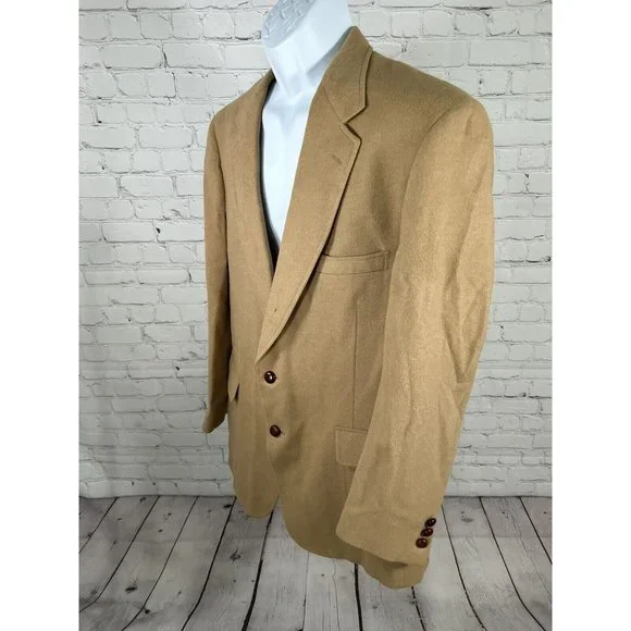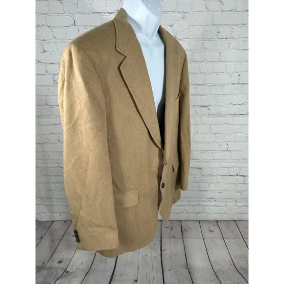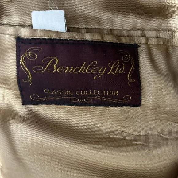 This vintage Benchley Ltd blazer jacket is a timeless piece for any formal or casual occasion. Made of high-quality camel hair material, this classic collection blazer features a solid brown pattern with a notch lapel style and single-vented jacket vent style. The jacket sleeve button style is three-button with a two-button front button style. This blazer jacket also includes inner pockets for convenience.The size of this blazer is 44R with a chest size of 46, perfect for men who prefer a classic fit. It is pre-owned but in excellent condition and has been well-maintained with dry clean only garment care. This two-piece blazer jacket is suitable for any season, including winter, summer, fall, and spring. It is perfect for travel, weddings, parties, cocktail events, or business meetings.Stain on lapel and left sleeve. Sleeve buttons have a bit of wear. See photos for reference.Pit to pit 23”Waist front 22”Shoulder to shoulder 19”Shoulder to hem 32”Sleeve 26”