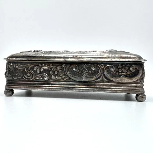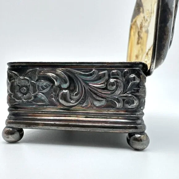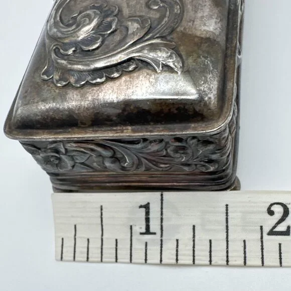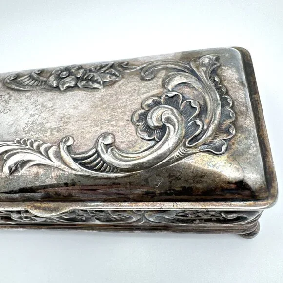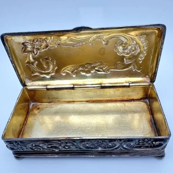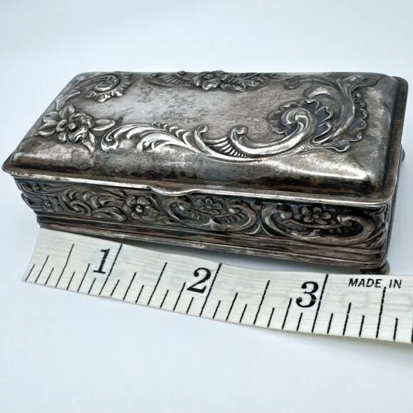 This elegant Wilcox Silver Plate Co box with a Gold Gilt interior crafted with intricate floral embossing, serves as an excellent storage solution for jewelry or small trinkets. Its hinged lid design combines functionality with a timeless aesthetic, making it a sophisticated addition to any decor.• Quadruple silver plate construction• Rectangular shape with floral detailing• Hinged lid for easy access• Interior gold-tone finish• Measurements: Length = 3.5 inches, Width = 2.5 inches, Height = 1inches approximatelyMinor tarnishing on the surface. Good pre-owned condition. Vintage or pre-owned items may have minor flaws or wear that are typical with age and use. Minor surface imperfections add to a vintage appeal. Please view all the photos provided as they are part of the condition description. The photos represent exactly what you will receive. They are my images and are not stock photos.Color may differ slightly from how it appears on your screen due to varying monitor settings.