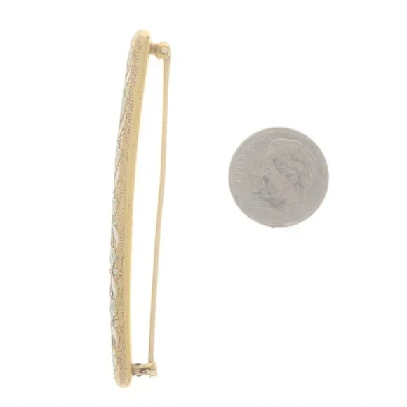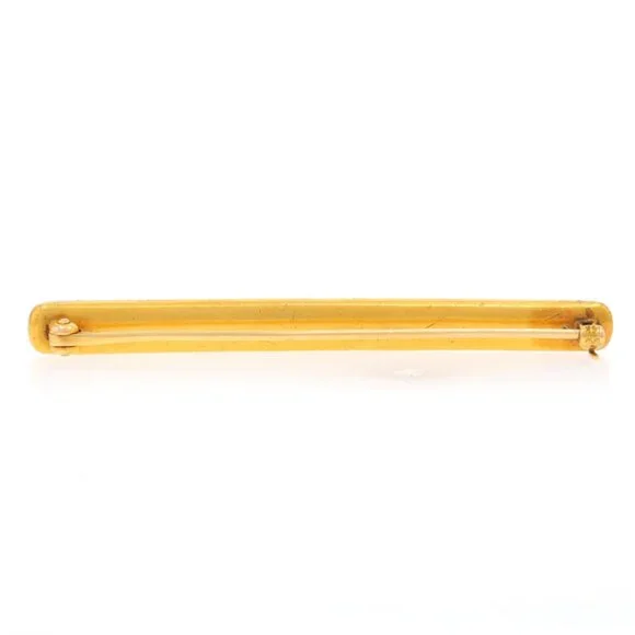 Era: EdwardianDate: 1900s - 1910sMetal Content: 14k Yellow GoldMaterial InformationMaterial: EnamelColor: Blue & WhiteStyle: Bar BroochFastening Type: Hinged Pin and Locking C-ClaspTheme: Flower GarlandMeasurementsTall: 1/4" (5.6mm)Wide: 2 1/2" (62.9mm)Weight: 4.8 GramsStamps: 14k, maker's markCondition: Pre-OwnedIn order to maintain its original antique integrity, this piece has not been professionally cleaned but it has been tested to guarantee metal content.