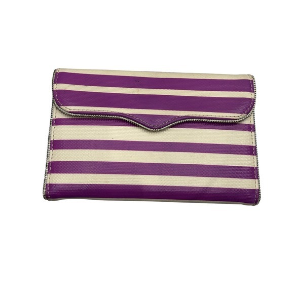 Rebecca Minkoff canvas continental wallet in a purple and white stripe pattern. This wallet features multiple interior card slots and compartments labeled PAPER and PLASTIC for organization. A silver snap closure secures the flap, and a silver zipper runs along the sides for added security.
